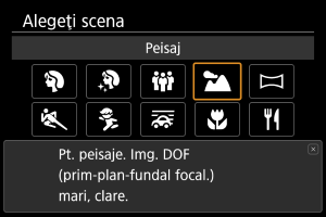 Folosiţi modul [] (Peisaj) pentru un cadru mai larg, pentru a putea focaliza oriunde, de la subiectul cel mai apropiat la subiectul cel mai depărtat. Pentru imagini cu nuanţe intense de albastru şi verde şi pentru imagini foarte clare.