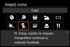 Folosiţi modul [] (Copii) pentru a fotografia copii activi care se mişcă. Tonul pielii va fi intens.