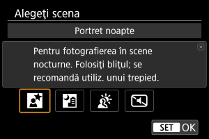 Folosiţi modul [] (Portret noapte) pentru fotografii luminoase şi frumoase cu persoane care au scene nocturne ca fundal. Fotrografierea în acest mod are nevoie de un bliţ extern. Se recomandă utilizarea unui trepied.