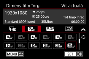 Selectaţi o rată pentru înregistrare cadre.