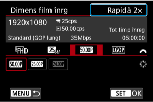 Filmele pot fi înregistrate pentru redare cu mişcare lentă sau rapidă. Sunetul nu este înregistrat. Setaţi viteza (de redare) slow sau fast motion în [: Dimens.film înrg.].