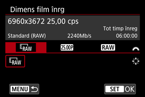 Puteţi seta rata de cadre şi tipul de RAW pentru ieşire film RAW.