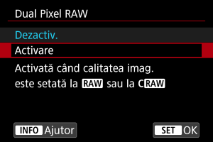 cu această funcţie activă produce imagini speciale Dual Pixel RAW care conţin informaţii dual pixel de la senzorul de imagine. Acest lucru este denumit fotografiere Dual Pixel RAW.
