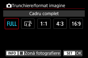 Când folosiţi un obiectiv RF sau EF, puteţi modifica formatul înainte de înregistrare. Puteţi folosi [1,6x (trunchiere)] pentru a fotografia ca atunci când folosiţi un obiectiv telefoto, deoarece această opţiune măreşte centrul imaginii (o zonă echivalentă cu dimensiunea APS-C).
