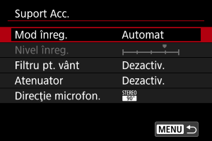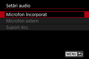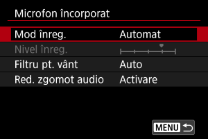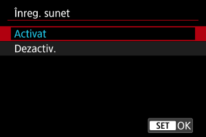 Selectaţi [Activ] pentru înregistrarea sunetelor în timpul filmării. Microfonul încorporat este folosit pentru înregistrate dacă nu folosiţi microfoane externe sau microfoane pentru patina multifuncţională.
