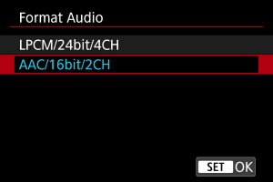 - Dacă selectaţi [LPCM/24bit/4CH] vă permite înregistrarea sunetului pe patru-canale. Dacă selectaţi [AAC/16bit/2CH] reduce înregistrarea la două canale (cu un singur microfon).