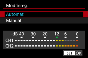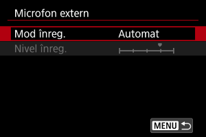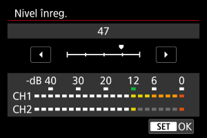 Puteţi regla nivelul de înregistrare al sunetului după cum doriţi. Reglaţi nivelul în [Nivel înreg.].