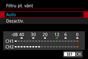 Setaţi la [Auto] (sau [Pornit]) pentru a elimina distorsiunile audio în spaţii deschise, cu vânt. Când este aplicat filtrul pentru vânt, va fi redusă şi o parte din nivelul basului.