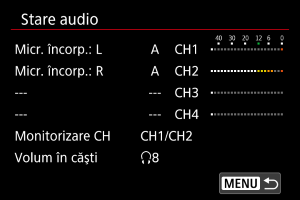 - [Monitorizare CH] arată canalele setate în [Monit. fotogr. CH] pentru [Căşti] în [