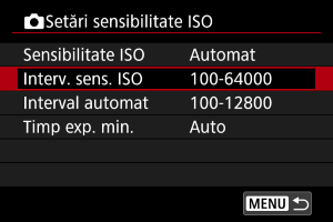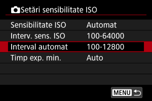 Puteţi seta intervalul ISO pentru Auto ISO.
