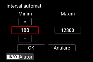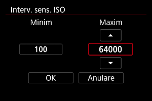Puteţi seta intervalul de setare pentru ISO manual (limitele minime şi maxime).