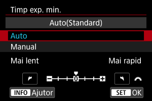 - Când este setat [Auto (Standard)] , timpul de expunere minim va fi 1/distanţa focală a obiectivului. Un singur pas de la [Mai lent] către [Mai rapid] este echivalent cu un pas întreg din timpul de expunere.