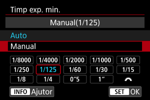 Pentru a preveni setarea automată a unui timp ce expunere prea lung, puteţi seta timpul de expunere minim pentru ISO auto.