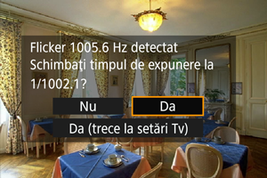 Aparatul detectează sursele de lumină 50.0–2011.2 Hz şi afişează un timp de expunere potrivit pentru fotografierea cu surse de lumină care pâlpâie la frecvenţe ridicate. Apoi puteţi trece la timpul de expunere indicat.