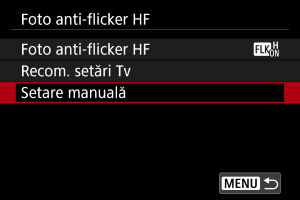 Realizaţi următoarele dacă este afişat [Flicker nedetectat] sau dacă schimbarea timpului de expunere nu elimină benzile.