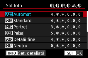 - Puteţi readuce la valorile implicite stilul şi setările [Def. utilizator. *] dacă selectaţi [Setări de bază] în [