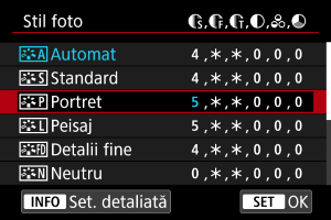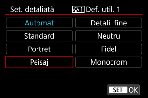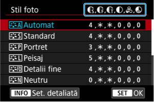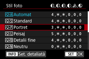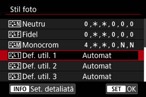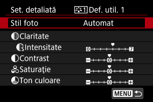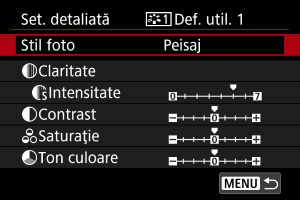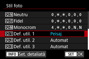 Puteţi selecta un Stil foto de bază precum [Portret] sau [Peisaj], puteţi regla parametrii acestuia după cum doriţi şi să îl înregistraţi la [Def. util. 1] – [Def. utilizator 3]. Folositor când doriţi să creaţi mai multe Stiluri foto cu setări diferite.