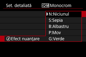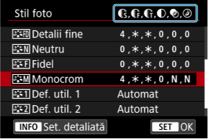 Puteţi personaliza orice Stil foto prin modificarea faţă de valorile implicite. Pentru detalii despre personalizarea [Monocrom], Consultaţi Reglare monocrom.