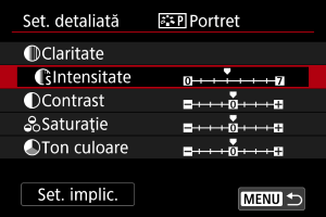 - Selectând [Set. implic.] la pasul 3, puteţi readuce Stilul foto respectiv la setările de parametri implicite.