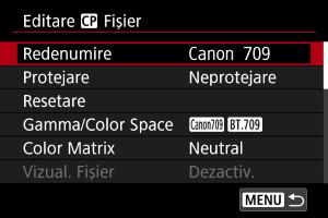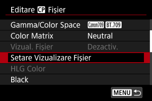 - Nu puteţi folosi un Fişier aspect dacă modificaţi setările pentru [Gamma/Spaţiu culoare], [HLG Color] sau [Peste 100%] după înregistrare.