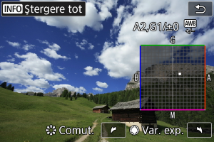 Puteţi corecta balansul de alb care este setat. Această reglare va avea acelaşi efect ca atunci când folosiţi un filtru de conversie a temperaturii culorii sau un filtru de compensare a culorii disponibile în comerţ.