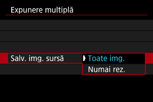 Cu [Salvaţi img. sursă: Toate img.], toate expunerile singulare şi imaginea cu mai multe expuneri combinate creată până în acel moment sunt salvate înainte de a ieşi. Cu [Salvaţi img. sursă: Numai rez.], doar imaginea cu mai multe expuneri combinate creată până în acel moment este salvată înainte de a ieşi. |