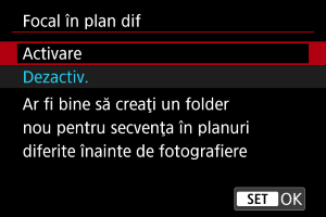 - Selectaţi [Dezactivare] dacă nu doriţi ca aparatul să efectueze compunerea profunzimii. Sunt salvate doar imaginile înregistrate.