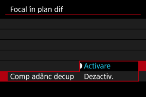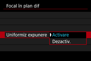 - Selectaţi [Dezactivare] dacă nu doriţi ca aparatul să compenseze pentru schimbările la luminozitatea imaginii în timpul focalizării în plan diferit. Folosiţi această opţiune pentru alte scopuri decât compunerea profunzimii pentru imaginile realizate în DPP ().