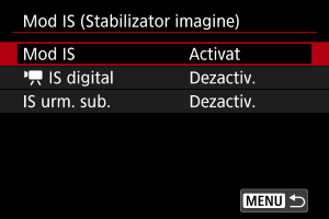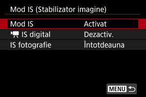 IS digital] la [Activare] sau [Îmbunătăţit] va seta şi [Mod IS] la [Activare].