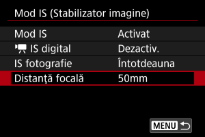 Stabilizarea imaginii în funcţie de distanţa focală specificată este posibilă dacă setaţi distanţa focală când folosiţi obiective care nu sunt compatibile cu comunicarea.