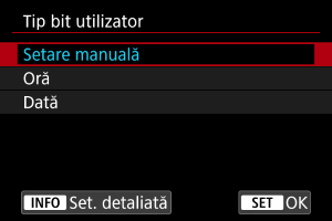 Puteţi adăuga informaţii la alegere (o valoare hexadecimală din 8 cifre, ora sau data) la bitul de utilizator al codului temporal.