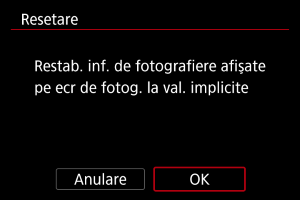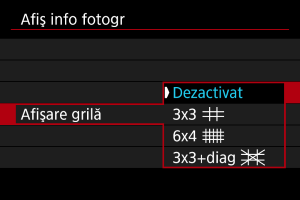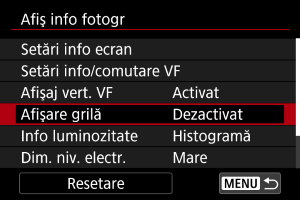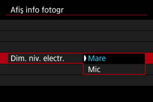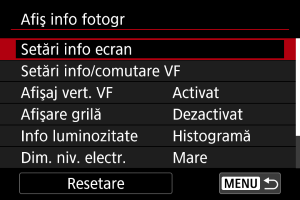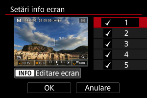 sus sau jos pentru a selecta ecranele cu informaţii pe care să le afişaţi pe aparat.