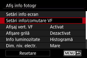 sus sau jos pentru a selecta ecranele cu informaţii pe care să le afişaţi în vizor.