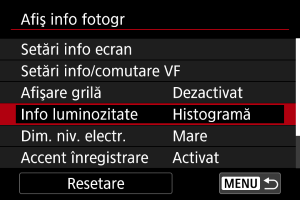 Selectaţi tipul de histogramă ([Luminozitate] sau [RGB]) şi dimensiunea de afişare ([Mare] sau [Mic]).