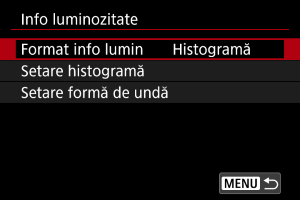 Puteţi seta formatul informaţiilor privind luminozitatea (histogramă sau monitor de formă de undă) disponibil atunci când apăsaţi butonul în timpul stării de aşteptare pentru înregistrare.