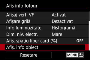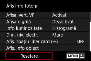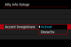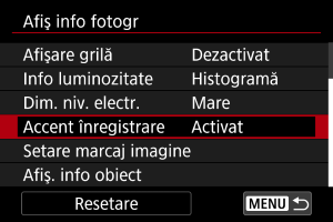 Puteţi personaliza detaliile şi ecranul cu informaţii afişat pe ecran sau în vizor când înregistraţi.