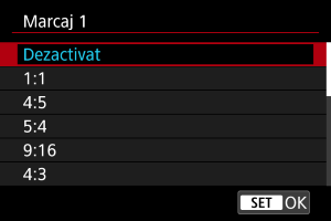 sus sau jos pentru a selecta opţiunile pe care să le afişaţi în vizor.