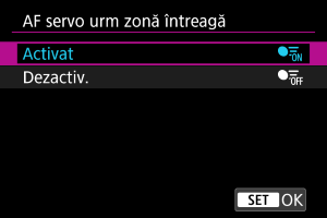 : AF servo urm zonă întreagă] la [Activ] sau [Oprit] dacă apăsaţi butonul
