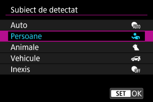 Dacă selectaţi o altă opţiune decât [Inexis] va afişat un cadru de urmărire [] pentru subiectul principal detectat. Cadrul de urmărire se va mişca pentru a urmări subiectul care începe să se mişte.