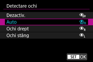 Puteţi fotografia cu ochii subiectului focalizaţi dacă setaţi [: Detectare ochi] la o altă opţiune decât [Dezactivare] ().