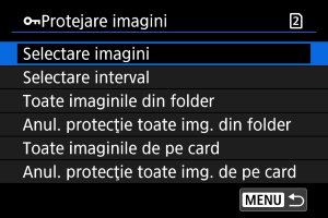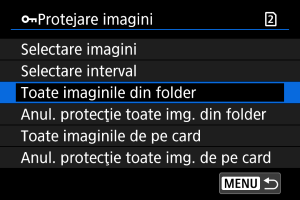 - Pentru a anula protejarea imaginii, selectaţi [Anul. protecţie toate img. din folder] sau [Anul. protecţie toate img. de pe card].