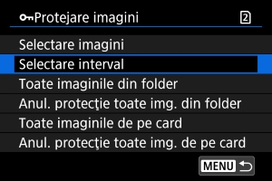 - Protejarea şi neprotejarea imaginilor dacă selectaţi [Toate imaginile de pe card] sau [Anul prot toate de pe card] se aplică pentru cardul selectat în [