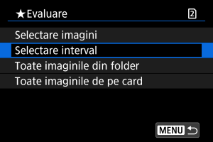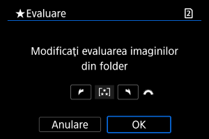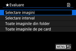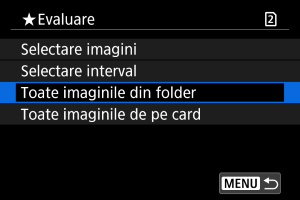 : Evaluare], dacă selectaţi [Toate imaginile din folder] sau [Toate imaginile de pe card], toate imaginile din director sau de pe card vor fi evaluate.