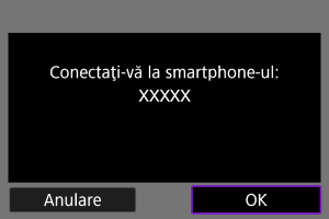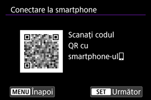 - Dacă nu este instalată Camera Connect, folosind smartphone-ul scanaţi codul QR afişat pentru a accesa Google Play sau App Store pentru a instala Camera Connect, apoi apăsaţi