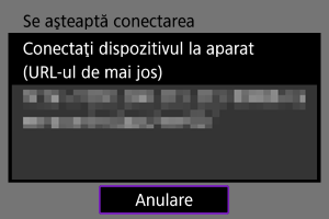 - Când ecranul de mai sus apare pe cameră, utilizaţi smartphone-ul, calculatorul sau alt dispozitiv pentru a accesa URL-ul indicat din aplicaţia dezvoltată pentru controlul camerei.