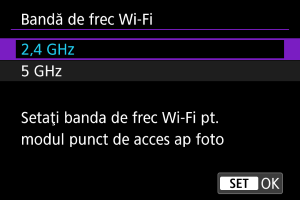 Selectaţi banda pentru modul punct de acces al aparatului, dacă este nevoie. Această bandă de frecvenţă se aplică şi conexiunilor Wi-Fi stabilite utilizând funcţiile Bluetooth.