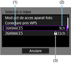 - Spaţiul gol din (2) indică faptul că au fost detectate mai multe SSID-uri cu acelaşi nume. Selectarea unui SSID pentru care (2) este necompletat conectează aparatul foto la punctul de acces dintre acestea care are cel mai puternic semnal.