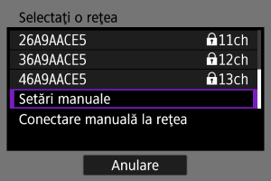 Selectaţi [Setări manuale] pe ecranul [Selectaţi o reţea].