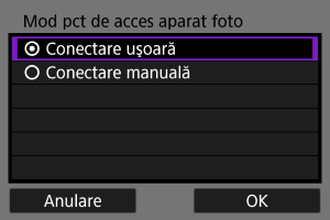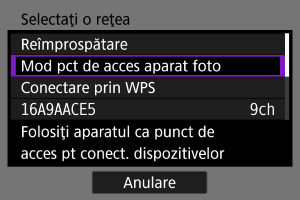 Selectaţi [Mod pct de acces aparat foto] pe ecranul [Selectaţi o reţea].