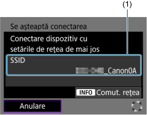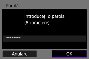 - În setările Wi-Fi ale celuilalt dispozitiv, selectaţi SSID (denumirea reţelei) afişată pe ecranului aparatului, apoi introduceţi parola.